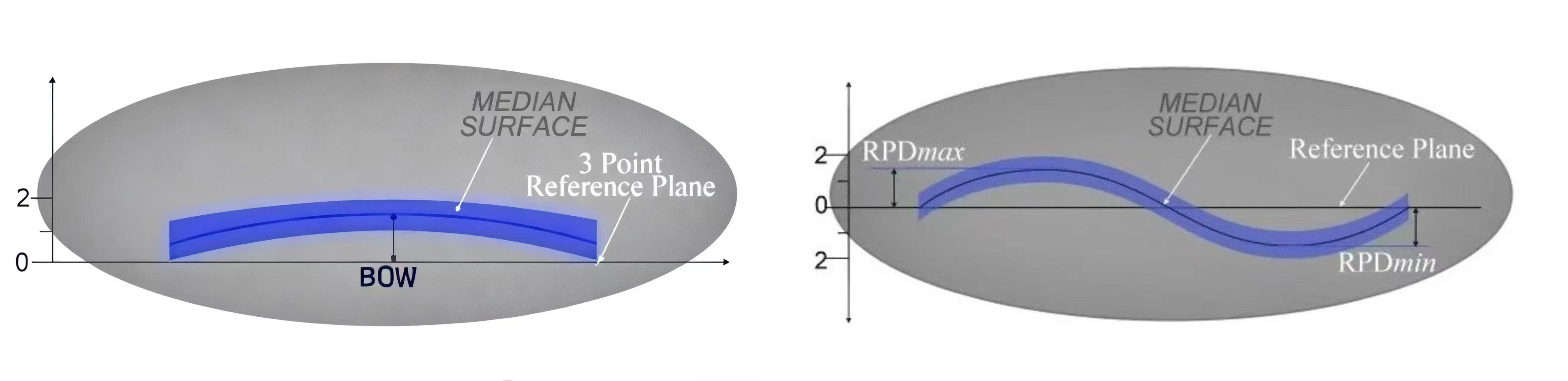 نشانگر کمان بر روی افست عمودی ناحیه مرکز ویفر تمرکز می کند که فقط حالت خمش موضعی را منعکس می کند. برای ارزیابی سناریوهایی که به مسطح بودن محلی حساس هستند مناسب است. نشانگر Warp برای ارزیابی صافی و اعوجاج کلی مفید است زیرا انحراف کل سطح ویفر را در نظر می گیرد و اطلاعاتی در مورد صافی کلی برای کل ویفر ارائه می دهد.