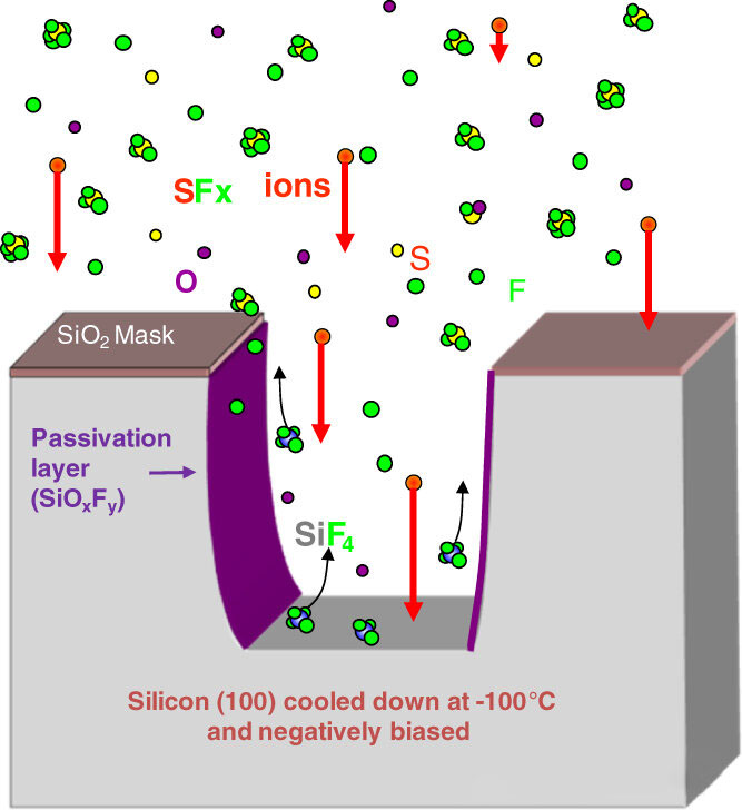 با در نظر گرفتن سیلیکون کریستالی به عنوان مثال، آرایش اتمهای سیلیکون در جهتگیریهای کریستالی متفاوت است، و در نتیجه واکنشپذیری با گاز حکاکی و نرخهای اچ تغییر میکند. در حین اچ کردن، این تفاوتها در خواص مواد منجر به عمقهای اچ ناسازگار در مکانهای مختلف روی دیوارههای جانبی میشود که در نهایت باعث خمش دیوارههای جانبی میشود.