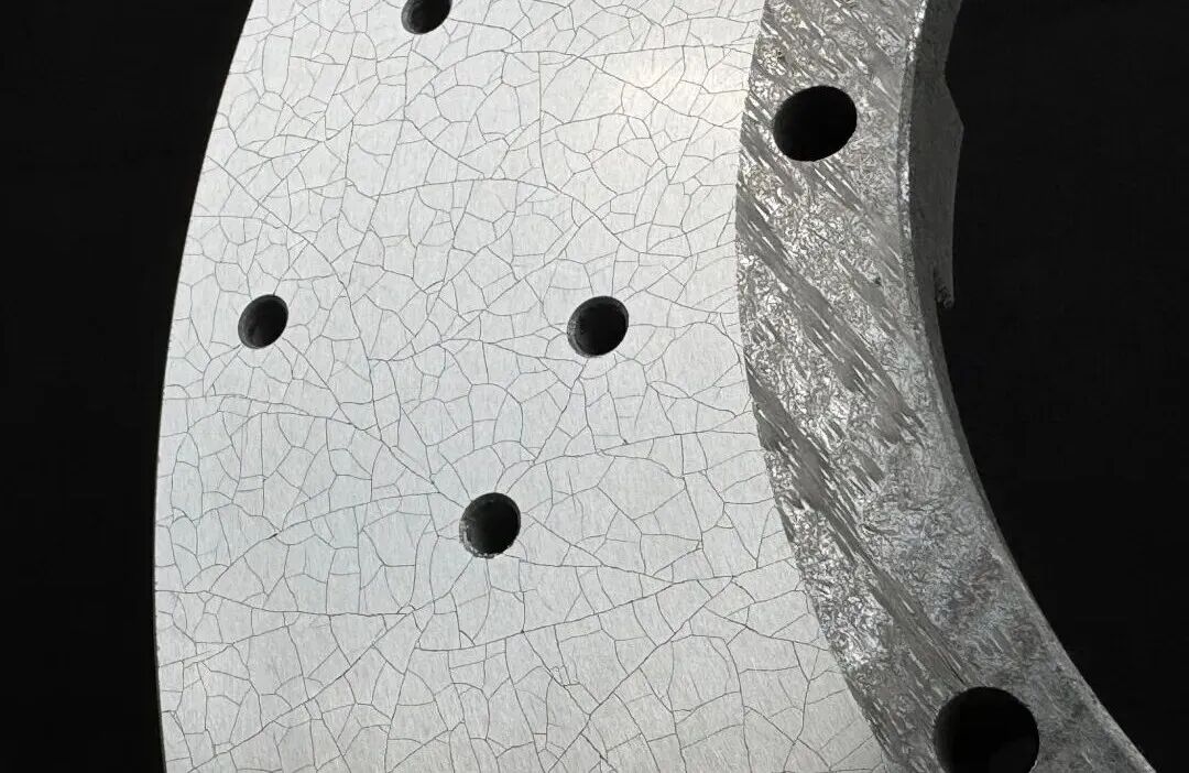 1) دیسک های ترمز کربن سرامیکی CCBروی سطح خود با پوشش SiC پوشانده شده و سطحی براق و ترک های ریز را نشان می دهد.
