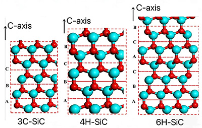 البته ماده SiC از یک چهار وجهی منفرد از یک اتم Si و یک اتم C تشکیل نشده است، بلکه از تعداد بی شماری اتم Si و C تشکیل شده است. تعداد زیادی از اتمهای Si و C لایههای اتمی دوتایی موجدار را تشکیل میدهند (یک لایه اتم C و یک لایه اتم Si)، و چندین لایه اتمی دوتایی روی هم قرار میگیرند تا کریستالهای SiC را تشکیل دهند. با توجه به تغییرات دوره ای که در طول فرآیند انباشته شدن لایه های اتمی دوگانه Si-C رخ می دهد، در حال حاضر بیش از 200 ساختار کریستالی مختلف با آرایش های متمایز وجود دارد. در حال حاضر، رایج ترین اشکال کریستالی در کاربردهای عملی عبارتند از 3C-SiC، 4H-SiC و 6H-SiC.