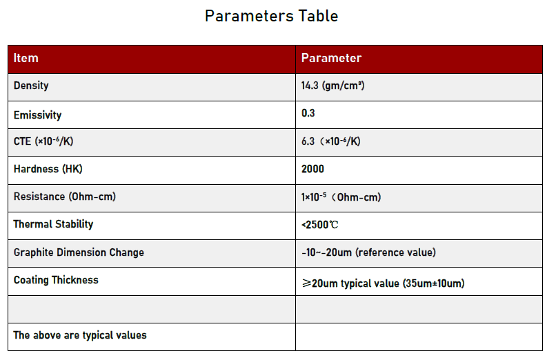 کاربید تانتالم ماده ای با عملکرد بالا با نقطه ذوب بسیار بالا (تقریباً 3880 درجه سانتیگراد)، هدایت حرارتی عالی، پایداری شیمیایی برتر و استحکام مکانیکی فوق العاده است. پارامترهای عملکرد خاص به شرح زیر است: